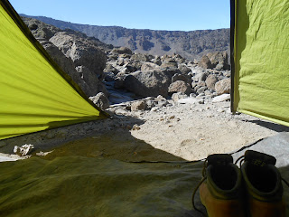 We go up for about two hours and then a combination of down and up for the next hour. At the third hour, we can see the camp for the night and it looks like a straightforward hike to get there. Wrong.You can't see the big scramble back down into the valley (and checking back on the website, it's Karanga Valley) and an uphill plod back up to camp for a hot lunch. I don't have pictures of the Karanga Valley, but the vegetation was something else: a combination of tropical looking pineapple trees and bushy lichens and mosses. Something out of another world.